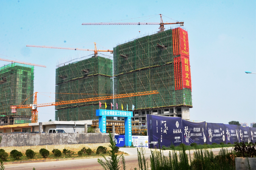 現(xiàn)場鞭炮齊鳴,煙花騰空而起,盛夏炎熱的陽光下,“金潮?格林春天封頂大吉”的巨幅廣告高高懸掛在春雨路西側(cè)拔地而起的大樓上。