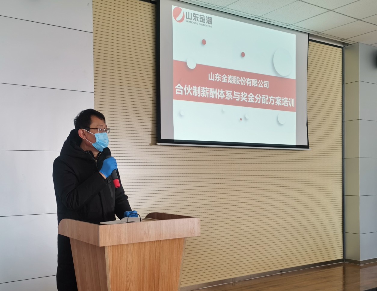 2020年3月5日,金潮股份公司在新材公司PVC三樓多功能廳舉辦了“山東金潮股份有限公司‘合伙制’薪酬體系與獎(jiǎng)金分配方案”的專題培訓(xùn)。本次培訓(xùn)由股份公司副總裁苑永海主持,各下屬企業(yè)總經(jīng)理、行政人事部負(fù)責(zé)人、財(cái)務(wù)部負(fù)責(zé)人及股份公司相關(guān)人員共計(jì)26人參加。